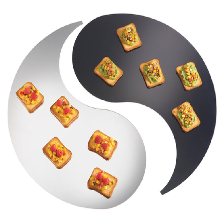 The Cal Mil PT245 Gourmet Display Mirror Tray is a precisely crafted piece designed to elevate the presentation of culinary creations in a unique manner. With a diameter of 24 inches and a height of 1/4 inch, this tray commands attention in any setting, whether at a high-end restaurant, catering event, or upscale buffet. The tray's distinctive ying-yang design adds an element of elegance and sophistication, making it an ideal choice for showcasing gourmet dishes or desserts. Constructed from high-quality acrylic, the tray combines durability with a sleek, mirrored finish that enhances the visual appeal of the culinary displays it supports. The rounded corners of the tray ensure safety and ease of handling, making it suitable for a variety of environments, including hospitality venues and fine dining establishments. This mirror tray not only serves as a functional platform for food presentation but also contributes to the ambiance and aesthetic of the dining experience, appealing to both chefs and event planners seeking a versatile and stylish display solution. The Cal Mil PT245 Gourmet Display Mirror Tray seamlessly integrates form and function, making it an essential tool for professionals who prioritize both style and practicality in their service offerings.