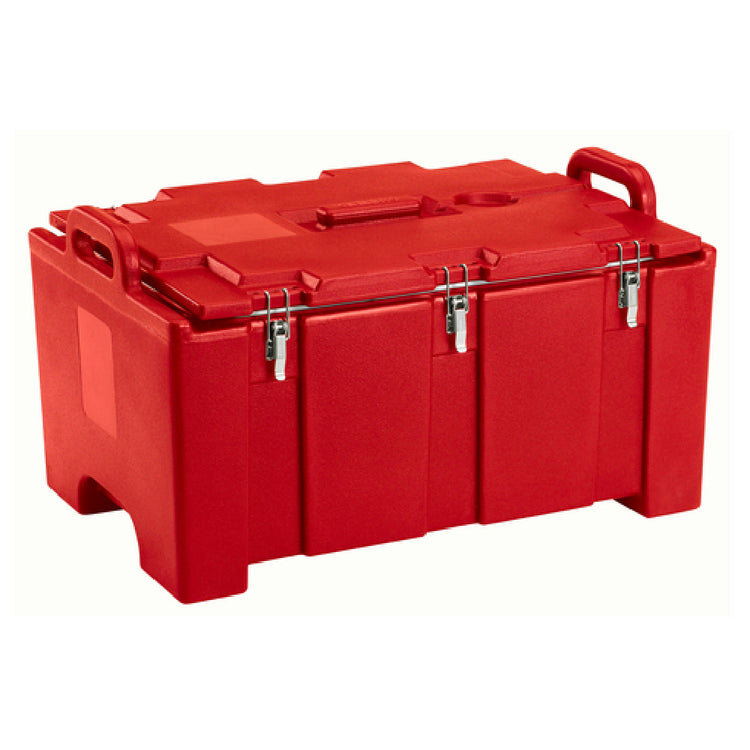 The Cambro 100MPC158 Camcarrier® is a top-loading insulated food carrier meticulously designed to accommodate one GN full-size or fractional pans with depths up to 8 inches. This unit boasts an approximate capacity of 40 quarts, providing ample space for catering and food transport needs. The Camcarrier® is optimized for temperature retention, maintaining hot contents between 190°F and 179°F, and cold items between 33.9°F and 35.8°F for up to four hours, ensuring food quality and safety during transit. Constructed with a robust polyethylene exterior, it features a scratch-resistant textured finish for durability in demanding environments. The seamless, double-wall design is filled with polyurethane foam insulation for enhanced thermal efficiency. The unit is equipped with two molded-in handles for easy carrying, six recessed stainless steel latches for secure closure, and includes a removable gasket for straightforward cleaning and maintenance. A passive vent slot facilitates pressure equalization. This Camcarrier® is both dishwasher safe and NSF certified, reflecting its commitment to food safety standards. Offered in a vibrant hot red color, the Cambro 100MPC158 is a reliable and practical solution for professionals in catering, hospitality, and food service industries who require dependable heat and cold retention in their food transport systems.
