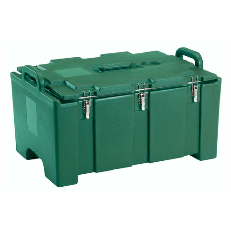 The Cambro 100MPC519 Camcarrier® is a versatile top-loading unit designed to accommodate (1) GN full size or fractional pans up to 8 inches deep, providing an approximate capacity of 40 quarts. This Camcarrier® excels at maintaining temperature retention, ensuring hot contents remain between 190°F and 179°F and cold items stay chilled at 33.9°F to 35.8°F for up to 4 hours. Featuring (2) molded-in handles and (6) recessed stainless steel latches, this carrier ensures secure handling and transport. The removable gasket and passive vent slot contribute to its efficient temperature control and easy maintenance, while the unit's dishwasher-safe design underscores its practicality in busy environments. Constructed from a durable polyethylene with a scratch-resistant textured exterior and one-piece seamless design, it boasts double wall, polyurethane foam insulation for superior temperature preservation. The Cambro 100MPC519 comes in a striking Kentucky green color and holds NSF certification, confirming its compliance with public health standards. This robust and reliable Camcarrier® is an ideal solution for catering services, hospitality industries, and food transportation sectors demanding durability, efficiency, and high performance in their operations.