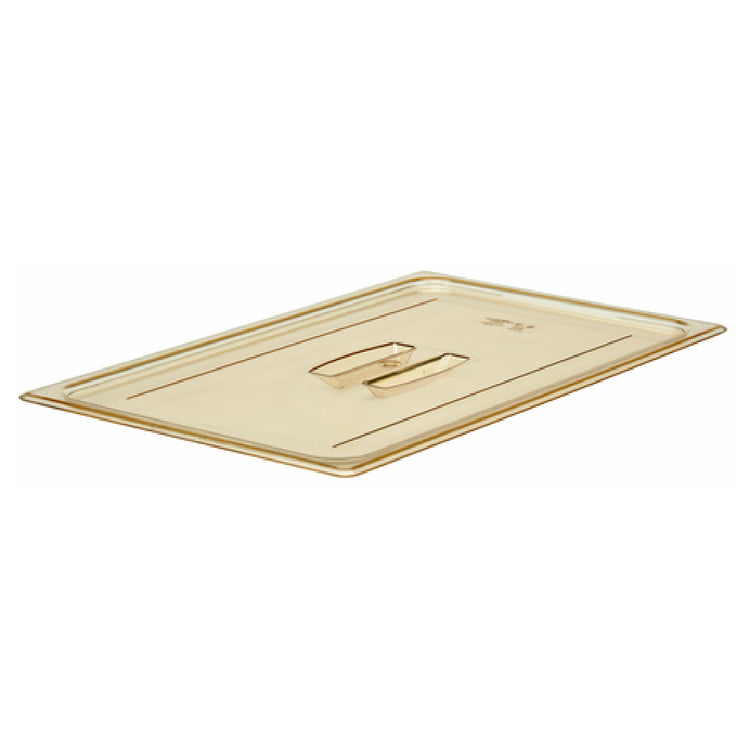 The Cambro 10HPCH150 H-Pan™ Food Cover High Heat Full Size is an innovative solution engineered for diverse food service environments requiring durability and versatility. This full-size, flat food cover is crafted to withstand extreme temperatures ranging from -40°F to 300°F, making it a reliable choice for both cold and hot food storage and transportation. The cover's non-stick surface ensures ease of cleaning and maintenance, reducing the risk of food residue build-up over time. The incorporation of a handle facilitates effortless handling and maneuverability within busy kitchen settings. Notably, this cover is designed to resist bending and denting, ensuring long-lasting performance and preserving its structural integrity even under frequent usage. Its amber color not only adds a distinctive visual appeal but also aids in temperature retention. The Cambro 10HPCH150 is NSF certified, signifying its compliance with high standards of food safety and hygiene, making it suitable for various segments within the food industry, including commercial kitchens, catering services, and institutional dining. This versatile and robust food cover is an essential accessory for any food service operation seeking to enhance efficiency and ensure the integrity of stored food items.