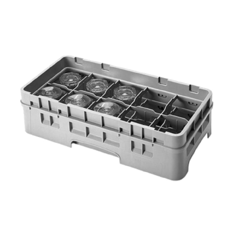 The Cambro 10HS318151 Camrack® Glass Rack With Soft Gray Extender Half Size is a versatile and practical solution tailored for a variety of professional settings. Designed with soft gray extenders, this half-size glass rack measures 10 inches by 19-3/4 inches by 5-5/8 inches. It features ten compartments, each accommodating glasses with a maximum diameter of 3-7/16 inches and a maximum height of 3-5/8 inches. This glass rack is HACCP compliant, ensuring it meets critical food safety and hygiene standards, and is NSF certified, reflecting its adherence to stringent health and safety regulations. The Camrack® Glass Rack is ideal for establishments like restaurants, hotels, and catering services looking to efficiently organize and transport glassware while protecting it from damage during handling and washing. Its compatibility with commercial dishwashers streamlines operations, enhancing productivity and maintaining cleanliness. The thoughtful design accommodates a variety of glass sizes, making it a valuable asset for any food service operation aiming to optimize its warewashing processes without compromising on quality or safety standards. This practical, durable product is a testament to Cambro's commitment to delivering reliable and efficient solutions for the hospitality industry.