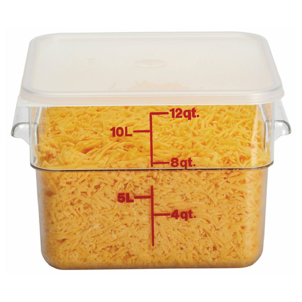 The Cambro 12SFSCW135 CamSquare® Food Container - 12 qt. - is a versatile and efficient solution for food storage needs across various sectors, including restaurants, catering, and food processing industries. With dimensions of 11-1/4"L x 12-1/4"W x 8-5/16"H, this container is designed to maximize storage space while maintaining ease of access and handling. Made from durable polycarbonate, it resists stains and odors, ensuring a hygienic environment for stored contents. The clear material allows for quick identification of the contents, reducing the need for constant opening and closing that could compromise freshness. This container includes red graduations for precise measurement, supporting accurate inventory management and portion control across diverse food service applications. The inclusion of handles facilitates easy transportation and handling within busy kitchen environments. Additionally, the Cambro 12SFSCW135 is dishwasher safe, making it simple to maintain cleanliness and sanitation standards. Certified by NSF, it meets stringent public health standards, providing assurance of quality and safety. This food container is an ideal choice for professionals seeking reliable, space-efficient food storage solutions that support operational efficiency and maintain product integrity.