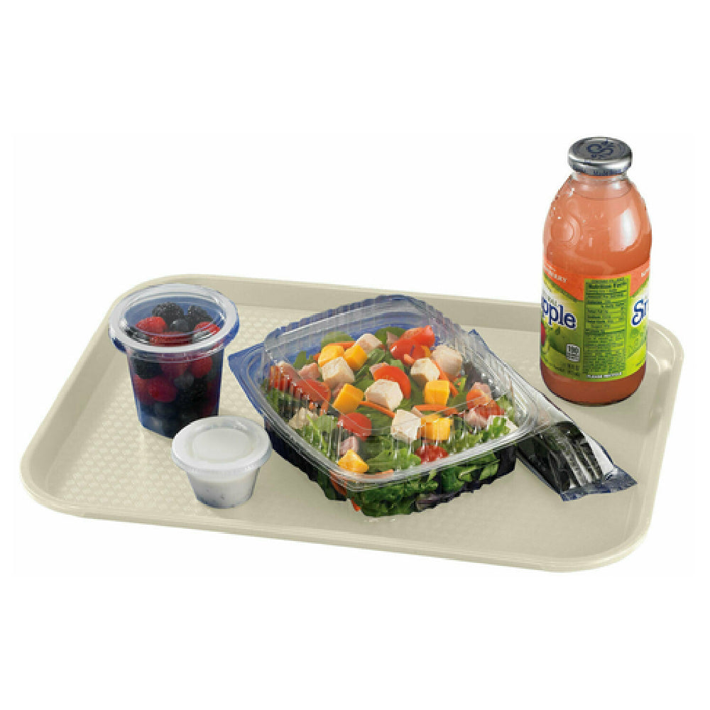 The Cambro 1418FF106 Fast Food Tray is a versatile and essential item for any fast-paced food service environment. Measuring 13-13/16 inches by 17-3/4 inches, this rectangular tray is designed to meet the rigorous demands of cafeterias, quick-service restaurants, and institutional dining settings. Its rigid bottom enhances stability, allowing for the secure transport of meals, while the textured surface prevents food from slipping, ensuring a safe and effective dining experience. Constructed from durable polypropylene, the tray is both lightweight and resilient, making it an excellent choice for frequent use. It is also dishwasher safe, which promotes hygiene and ease of maintenance, aligning with industry requirements. The light peach color adds a subtle aesthetic appeal, complementing various interior themes without overpowering the dining area. Moreover, the tray is NSF certified, confirming its compliance with strict public health and safety standards. This certification is particularly important for establishments aiming to maintain high levels of sanitation and safety. The Cambro 1418FF106 is not only practical but also a reliable choice, providing a balance between functionality and quality, making it a preferred option for those in the food service industry seeking dependable serving solutions.