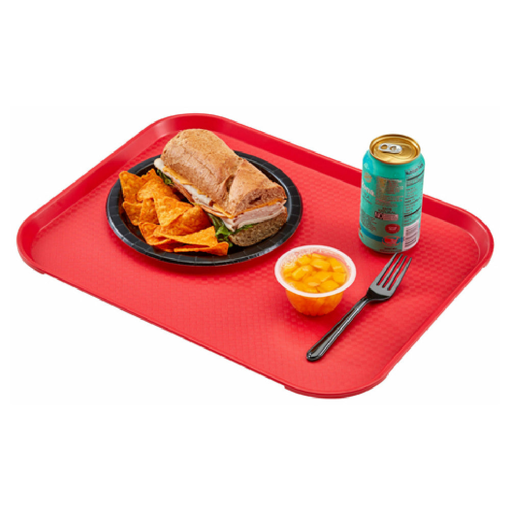 The Cambro 1418FF163 Fast Food Tray is a rectangular serving solution with dimensions of 13-13/16" x 17-3/4", tailored for the fast-paced demands of the food service industry. Crafted from durable polypropylene, this tray ensures longevity and resilience in various food service environments. Its rigid bottom structure provides stability, making it an ideal choice for handling multiple items securely. The tray's textured surface minimizes the risk of slipping, enhancing safety during transport. Available in a vibrant red hue, it adds a touch of color to any dining setting. A standout feature of the Cambro 1418FF163 is its dishwasher-safe design, simplifying maintenance and ensuring hygienic use across multiple service sessions. Furthermore, the tray is NSF certified, highlighting its adherence to high standards of public health and safety. This versatile fast food tray serves as a reliable asset in diverse market segments, including fast food restaurants, cafeterias, and casual dining establishments, where efficiency and durability are paramount.