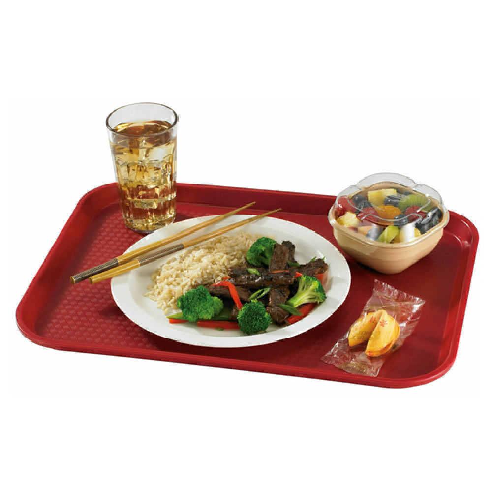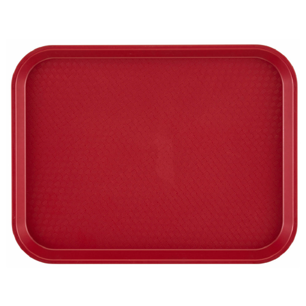 The Cambro 1418FF416 Fast Food Tray is a versatile and durable solution for various dining environments, measuring 13-13/16" x 17-3/4" in a practical rectangular shape. Its rigid bottom provides a stable surface, ensuring that meals are transported securely, making it particularly suitable for fast-paced food service settings. The textured surface not only adds to its aesthetic appeal but also enhances grip, reducing the risk of spills. Constructed from high-quality polypropylene, this tray is lightweight yet robust, capable of withstanding the demands of frequent use. Its cranberry color offers a pleasing visual contrast in any dining scenario. The tray is designed to be dishwasher safe, making it easy to clean and maintain, which is a crucial consideration in high-volume food service operations. Additionally, its NSF certification guarantees that it meets strict standards for public health protection, making it a reliable choice for ensuring sanitation and safety. This tray's blend of practicality and durability makes it an ideal fit for fast food chains, cafeterias, and other self-service dining facilities. Its reliable performance and easy maintenance make the Cambro 1418FF416 a valuable asset for operators seeking efficient and effective service solutions.