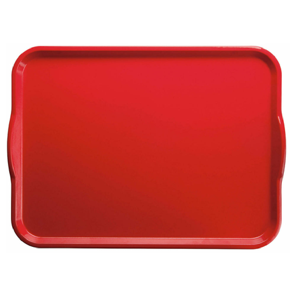 The Cambro 1520H521 Camtray® With Handles - Rectangular is a versatile and durable food service tray designed to meet the rigorous demands of various industry segments. This tray measures 15 inches by 20 inches, providing ample space for carrying meals, beverages, and utensils efficiently in cafeterias, restaurants, and catering events. Constructed from reinforced fiberglass, it boasts high-impact strength, ensuring longevity and resistance to wear and tear. The incorporation of handles enhances user convenience, allowing for easy transportation of contents, further increasing its utility in fast-paced environments. The Cambro red color not only adds a vibrant aesthetic appeal but also aids in quick identification and organization within a bustling service setting. As an NSF certified product, the 1520H521 Camtray® adheres to stringent public health and safety standards, making it a reliable choice for establishments prioritizing sanitation and compliance. Its robust design and practical features make the Cambro 1520H521 an essential tool for efficient food service operations, providing a balance of form and function suitable for diverse market segments within the food service industry.