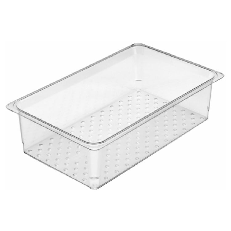 The Cambro 15CLRCW135 Camwear® Colander is a versatile and essential tool tailored for various segments within the food service industry. Measuring at 12-3/4 inches by 20-7/8 inches and with a depth of 5 inches, this colander is specifically designed to fit 1/1 size food pans, making it an ideal choice for commercial kitchens that need efficient food drainage solutions. Constructed from durable polycarbonate, the Cambro Camwear Colander ensures long-lasting use and superior performance under rigorous conditions. Its clear design allows for easy visibility, aiding kitchen staff in monitoring food content effortlessly. Certified by NSF, this colander meets strict public health standards, ensuring safety and quality in food handling. Whether used in a bustling restaurant or a catering service, the Cambro Camwear® Colander provides a reliable and efficient means of draining and handling a variety of food items, enhancing operational efficiency and maintaining high hygiene standards. Its precise dimensions allow for seamless integration into existing kitchen setups, while the robust polycarbonate material offers resistance to breakage and staining, making it a valuable addition to any food service establishment looking to optimize their kitchen operations.