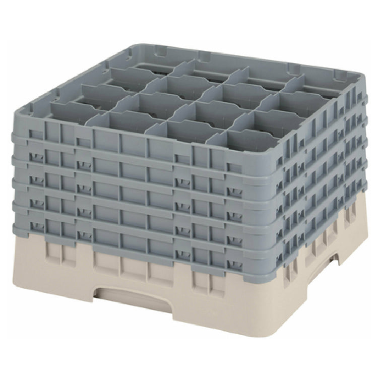 The Cambro 16S1058184 Camrack® Glass Rack with (5) soft gray extenders is a full-size solution designed for the efficient handling and storage of glassware across various sectors such as hospitality, catering, and food service industries. Measuring 19-3/4" x 19-3/4" x 12-1/8", this rack features 16 compartments, each accommodating a maximum diameter of 4-3/8" and a height of up to 11", ensuring a versatile fit for different glass sizes. The inclusion of five soft gray extenders enhances its capacity and flexibility, allowing for the secure stacking and transport of delicate items. Constructed in a neutral beige color, it complements a range of kitchen and serving environments. Emphasizing health and safety, the Cambro 16S1058184 is HACCP compliant and NSF certified, providing assurance of its adherence to strict hygiene standards. This glass rack is particularly valuable for establishments that require robust and reliable dishwashing and storage solutions, standing out for its durable design and functional efficiency. Its technical specifications and compliance certifications make it a distinguished choice for businesses prioritizing operational efficiency and safety in their glassware management processes.