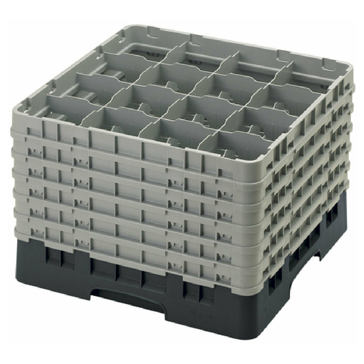 The Cambro 16S1214110 Camrack® Glass Rack With (6) Soft Gray Extenders Full Size is a versatile glass rack solution designed for various sectors within the food service and hospitality industries. This full-size glass rack measures 19-3/4" x 19-3/4" x 13-3/4", providing ample space with its 16 compartments, each accommodating a maximum diameter of 4-3/8" and a maximum height of 12-5/8". The rack features six soft gray extenders, which enhance its capacity and enable the safe and efficient handling of glassware. Its black color gives it a sleek appearance, aligning with modern kitchen aesthetics. HACCP compliance ensures that it meets rigorous hygiene standards, and its NSF certification underscores its adherence to public health and safety requirements. The Cambro 16S1214110 is engineered to deliver outstanding performance in high-volume environments, making it a reliable choice for establishments that prioritize both functionality and compliance with industry regulations.
