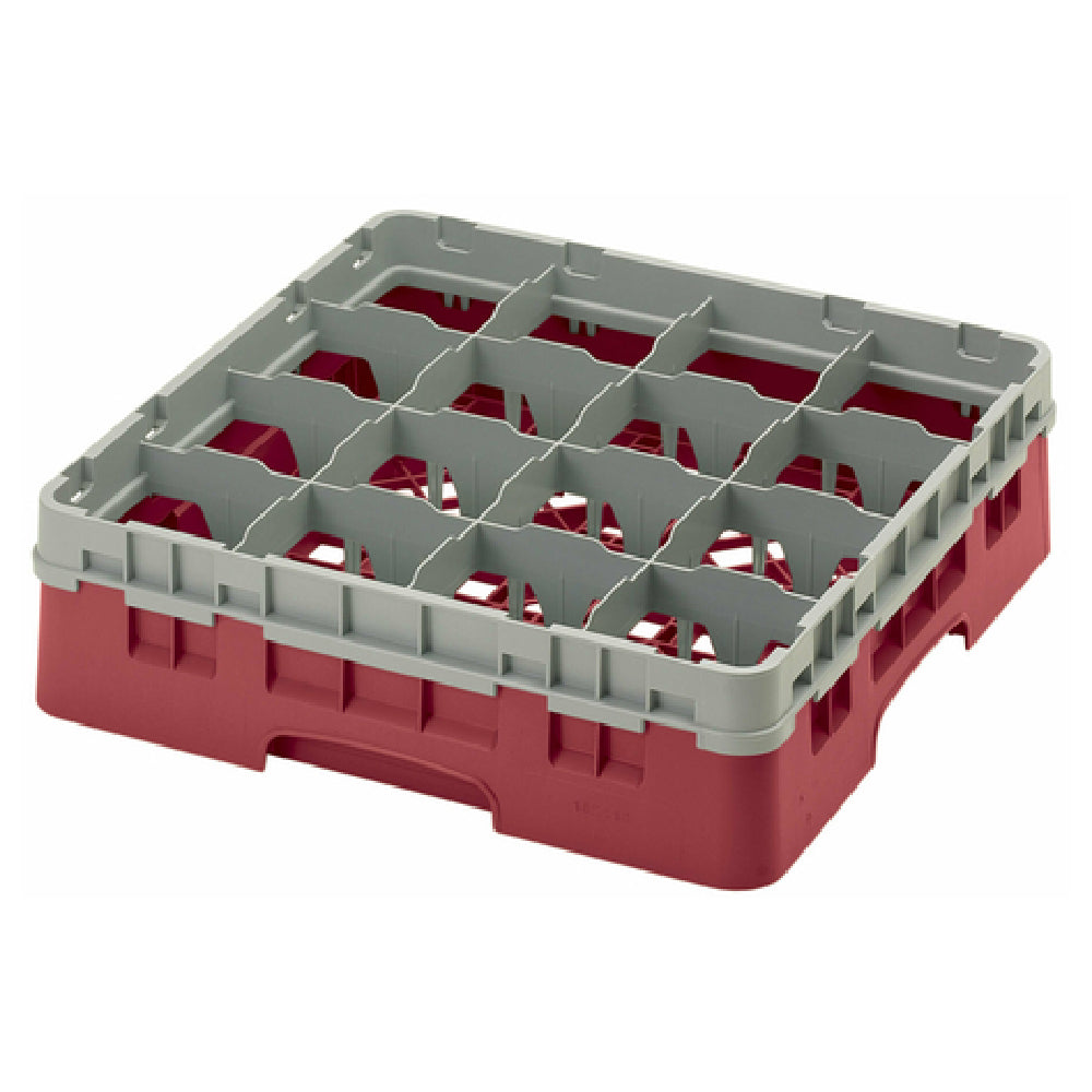 The Cambro 16S418416 Camrack® Glass Rack With Soft Gray Extender Full Size is a meticulously designed storage solution for glassware, tailored to meet the demands of the foodservice and hospitality industry. Measuring 19-3/4" x 19-3/4" x 5-5/8", this full-size glass rack is engineered to accommodate up to 16 compartments, providing ample space for glassware with a maximum diameter of 4-3/8" and a maximum height of 4-1/2". The soft gray extender enhances its functionality by allowing for additional height and protection of glassware. The rack's cranberry color not only adds a touch of vibrancy but also aids in easy identification and organization within a busy kitchen environment. This glass rack is HACCP compliant, reinforcing its suitability for maintaining hygiene and safety standards. Additionally, its NSF certification attests to its adherence to rigorous public health and safety guidelines. The Cambro 16S418416 Camrack® Glass Rack is an ideal choice for restaurants, bars, and catering operations seeking efficient and compliant glassware management. Its robust design and thoughtful features ensure that glassware is stored securely, making it a valuable asset in any professional setting.