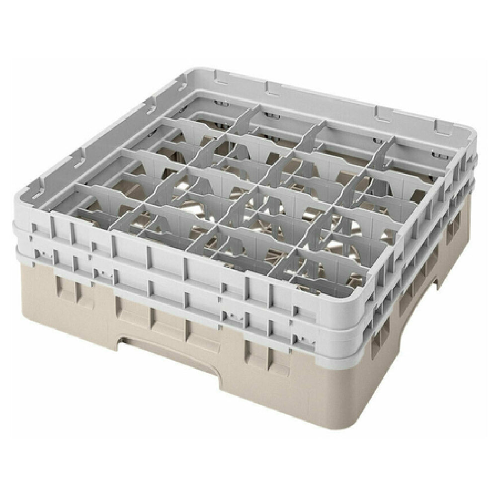 The Cambro 16S434184 Camrack® Glass Rack With (2) Soft Gray Extenders Full Size is a highly specialized storage solution designed to meet the diverse needs of food service establishments. Measuring 19-3/4" x 19-3/4" x 7-1/4", this glass rack provides ample space with (16) compartments, each accommodating a maximum diameter of 4-3/8" and a height of up to 5-1/4". Its soft gray extenders enhance its storage capacity, making it ideal for operations requiring efficient and organized glassware handling. The rack's full-size dimensions make it a versatile choice for large-scale hospitality settings, from restaurants to event catering services. Crafted in a beige color, it complements various kitchen and service environments while ensuring compliance with HACCP standards, promoting food safety and hygiene. Additionally, the NSF certification highlights its adherence to public health and safety guidelines, assuring quality and reliability. The Cambro 16S434184 Camrack® Glass Rack is a practical and durable choice for businesses seeking to optimize their glassware storage, with its robust construction catering to the high demands of busy kitchens and service areas.