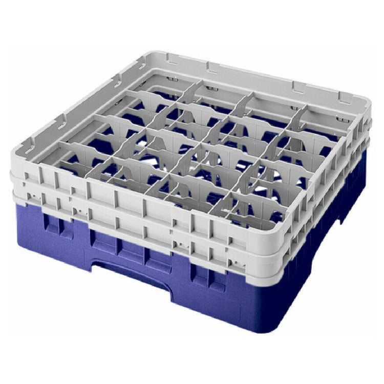 The Cambro 16S434186 Camrack® Glass Rack With (2) Soft Gray Extenders Full Size is meticulously engineered to cater to the precise needs of the foodservice industry, particularly in the areas of glassware storage and transport. Measuring a full size at 19-3/4 inches by 19-3/4 inches by 7-1/4 inches, this glass rack features 16 spacious compartments, each accommodating a maximum diameter of 4-3/8 inches and a maximum height of 5-1/4 inches. Its soft gray extenders enhance functionality by providing added flexibility and protection for taller glassware, making it suitable for a range of glass sizes. The navy blue rack is HACCP compliant, ensuring it meets critical food safety standards, and NSF certification underscores its adherence to public health and safety regulations. This Camrack is particularly beneficial in segment markets such as restaurants, hotels, or catering services that require efficient, safe, and organized glassware handling. The robust structure and design ensure durability and ease of use, while the compatibility with industry standards makes it a reliable choice for maintaining hygiene and operational efficiency in dynamic kitchen environments. Its thoughtful design positions the Cambro 16S434186 as an indispensable tool for professionals seeking quality and compliance.