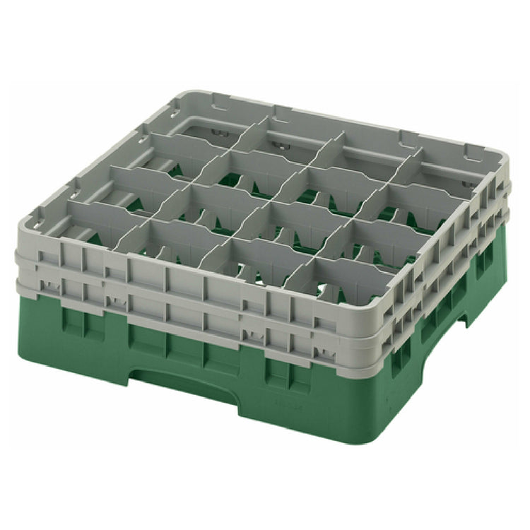 The Cambro 16S534119 Camrack® Glass Rack with (2) Soft Gray Extenders Full Size is a highly efficient and versatile storage solution designed for the foodservice industry. This full-size rack measures 19-3/4" x 19-3/4" x 7-1/4" and is equipped with 16 compartments, each accommodating glassware with a maximum diameter of 4-3/8" and a maximum height of 6-1/8". The inclusion of soft gray extenders enhances the rack's capacity and usability, allowing for secure and organized storage of glassware. Crafted in a distinctive Sherwood green, the Camrack® not only ensures durability but also compliance with HACCP standards, making it a reliable choice for maintaining hygiene and safety in professional kitchens. Additionally, the rack is NSF certified, confirming its adherence to strict public health and safety regulations. Its thoughtful design caters to various segments within the foodservice industry, offering a practical and robust solution for catering operations, restaurants, and bars that require efficient glassware management. The Cambro 16S534119 Camrack® Glass Rack is an essential asset for establishments seeking to optimize storage space while maintaining impeccable standards of cleanliness and organization.