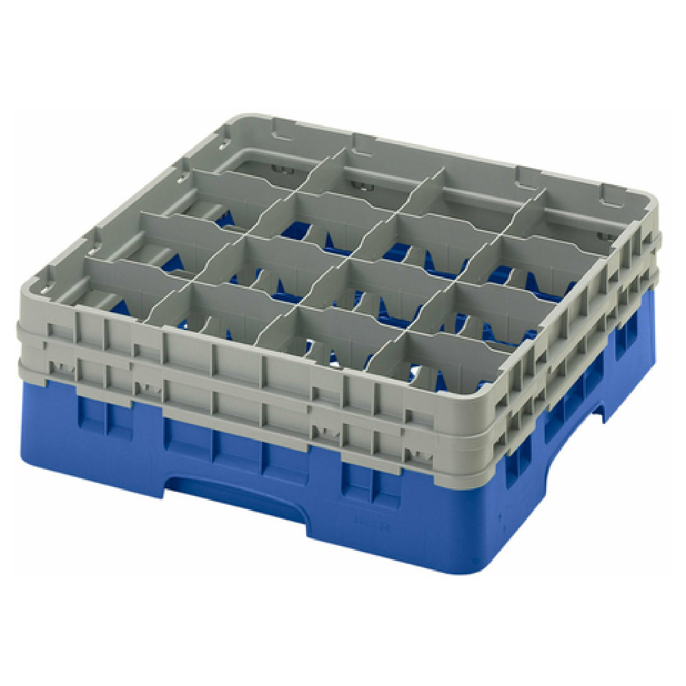 The Cambro 16S534168 Camrack® Glass Rack With (2) Soft Gray Extenders Full Size is a meticulously designed solution crafted for efficient glassware management in various food service operations. Measuring 19-3/4" x 19-3/4" x 7-1/4", this full-size glass rack accommodates (16) compartments, each capable of holding glassware with a maximum diameter of 4-3/8" and a maximum height of 6-1/8". This makes it an excellent choice for securely handling medium to large glassware used in restaurants, bars, and catering services. The inclusion of two soft gray extenders enhances the rack’s ability to safely store taller glasses, providing flexibility and adaptability to diverse glass inventories. The blue color of the rack not only adds a visual distinction but also aligns with HACCP compliance standards, ensuring organized and clean glassware storage. Additionally, this product is NSF compliant, meeting rigorous health and safety requirements, which is crucial for maintaining high standards in the food and beverage industry. The Cambro 16S534168 Camrack® is engineered to deliver reliability and efficiency, making it an essential asset for any establishment that prioritizes quality and hygiene in glassware management.