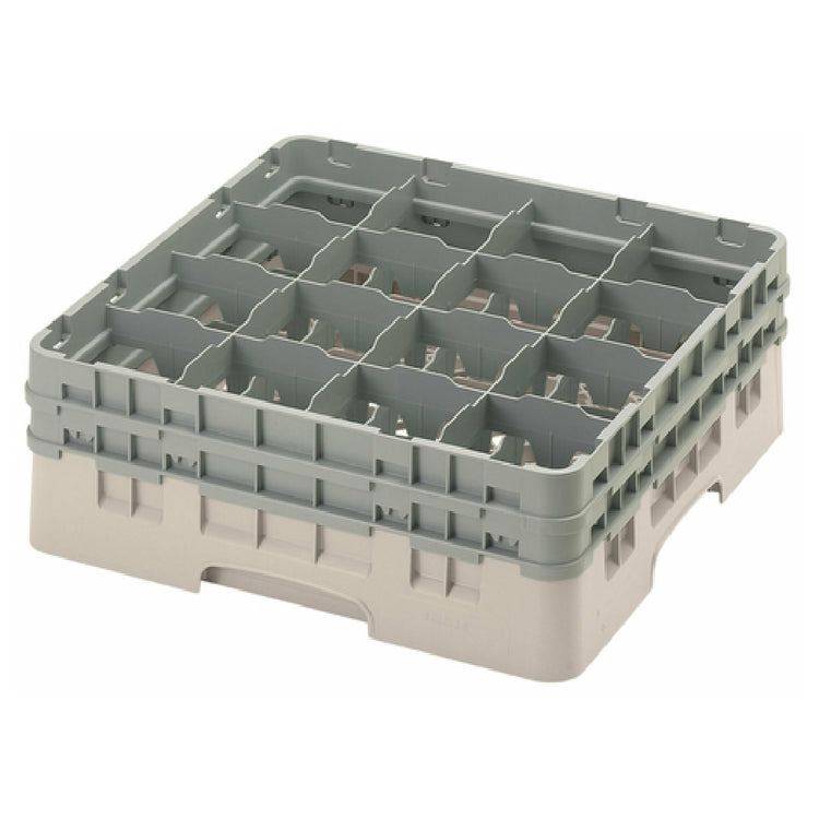The Cambro 16S534184 Camrack® Glass Rack with (2) soft gray extenders is a full-size, highly functional solution designed for efficient glassware handling and storage. Measuring 19-3/4 inches by 19-3/4 inches by 7-1/4 inches, this rack is robustly constructed to accommodate 16 compartments, each catering to glassware with a maximum diameter of 4-3/8 inches and a maximum height of 6-1/8 inches. The beige Camrack® is HACCP compliant, ensuring it meets high standards for food safety and hygiene, and is NSF certified, affirming its suitability for use in professional culinary environments. The inclusion of two soft gray extenders enhances its utility by providing additional space and flexibility. This glass rack is particularly valuable for sectors such as restaurants, hotels, and catering businesses that require efficient, organized, and safe glassware storage. Its practical design not only facilitates easy handling but also ensures that delicate glassware is securely positioned and protected during storage and transport. The Cambro 16S534184 Camrack® Glass Rack stands out in the industry for its combination of durability, capacity, and compliance with health standards, making it an indispensable tool for establishments demanding high performance and reliability in glassware management.