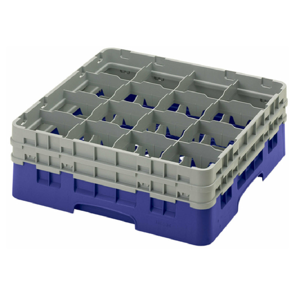 The Cambro 16S534186 Camrack® Glass Rack With (2) Soft Gray Extenders Full Size is a versatile solution for the efficient organization and transport of glassware in professional settings. This full-size rack measures 19-3/4 inches by 19-3/4 inches by 7-1/4 inches, providing ample space for various glass types. Featuring 16 compartments, each accommodating a maximum diameter of 4-3/8 inches and a height of up to 6-1/8 inches, this rack is designed to securely hold glasses of different sizes. The navy blue rack is complemented by two soft gray extenders, enhancing its capacity and versatility. It is HACCP compliant, ensuring it meets stringent food safety standards, and is NSF certified, attesting to its quality and reliability in commercial environments. The robust design makes it suitable for use in high-demand sectors such as restaurants, bars, and catering services, where efficient glass handling and hygiene are paramount. The Cambro Camrack's durable construction and thoughtful design make it an essential asset for businesses seeking to optimize their glassware management, offering a blend of functionality and reliability that is crucial in maintaining operational efficiency and cleanliness in the foodservice industry.