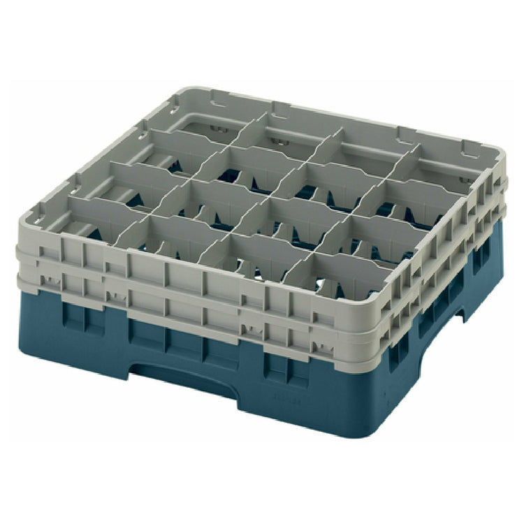 The Cambro 16S534414 Camrack® Glass Rack With (2) Soft Gray Extenders Full Size is a meticulously designed solution for efficient glassware storage and transportation. With dimensions of 19-3/4" x 19-3/4" x 7-1/4", this full-size rack is engineered to accommodate up to 16 glass compartments, each supporting a maximum diameter of 4-3/8" and a height of 6-1/8". The inclusion of two soft gray extenders enhances its capacity and versatility, ensuring it can meet varying storage demands. This rack comes in a striking teal color, making it easily identifiable in bustling environments. Its design complies with HACCP standards, which underscores its suitability in maintaining hygiene and safety, critical for any foodservice operation. Additionally, the NSF certification further attests to its adherence to public health and safety guidelines. The Camrack® Glass Rack is ideal for restaurants, catering services, and hospitality businesses that require a reliable, durable, and compliant solution for glassware management. Its thoughtful engineering and robust construction make it an indispensable asset for ensuring the longevity and cleanliness of your glassware, thus enhancing operational efficiency and service quality.