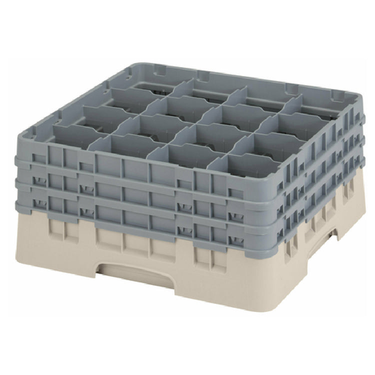 The Cambro 16S738184 Camrack® Glass Rack With (3) Soft Gray Extenders Full Size is a highly functional solution for safely storing and transporting glassware in various food service environments. This full-size rack measures 19-3/4" x 19-3/4" x 8-7/8", providing ample space with 16 compartments that each accommodate glassware with a maximum diameter of 4-3/8" and a maximum height of 7-3/4". The inclusion of three soft gray extenders enhances the versatility of the rack by allowing it to securely hold taller items, making it adaptable for venues ranging from high-end restaurants to busy catering services. Constructed with a beige finish, this Camrack® is HACCP compliant, ensuring adherence to stringent food safety protocols, and NSF certified, confirming its compliance with public health standards. These features make it an indispensable tool for maintaining hygiene and organization in any commercial kitchen or bar. The durable design and reliable performance of the Cambro 16S738184 Camrack® Glass Rack make it a valuable asset for any establishment looking to efficiently manage its glassware logistics, catering to the diverse needs of the food service industry.