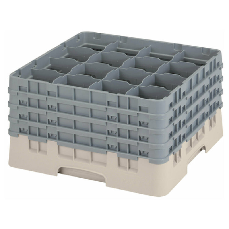 The Cambro 16S900184 Camrack® Glass Rack with (4) Soft Gray Extenders Full Size is engineered to accommodate the demanding needs of various segments within the hospitality and food service industries. This full-size rack measures 19-3/4" x 19-3/4" x 10-1/2" and is equipped with 16 compartments, each designed to handle a maximum diameter of 4-3/8" and a maximum height of 9-3/8". The inclusion of four soft gray extenders enhances its capacity and adaptability, catering to a wide range of glass sizes and shapes, which is crucial for establishments needing flexibility and efficiency in glassware handling. Its beige exterior not only provides a clean, professional appearance but also aligns with HACCP compliance, ensuring it meets critical safety standards. The NSF certification further underscores its quality and reliability in maintaining hygiene and safety in food service environments. By combining these distinct features, the Cambro 16S900184 Camrack® Glass Rack delivers a practical solution for restaurants, hotels, and catering businesses aiming to optimize their glassware storage and handling processes, ensuring durability and efficiency while adhering to the industry's stringent standards.