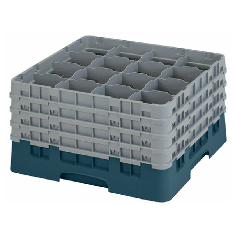 The Cambro 16S900414 Camrack® Glass Rack with (4) soft gray extenders full size is a highly efficient and durable solution for organizing and transporting glassware in a variety of industry settings. Featuring dimensions of 19-3/4" x 19-3/4" x 10-1/2", it is designed to accommodate up to 16 individual compartments, each capable of holding glassware with a maximum diameter of 4-3/8" and a maximum height of 9-3/8". This teal-colored glass rack is HACCP compliant, ensuring adherence to international food safety standards, and is NSF certified, which guarantees that it meets strict public health protection guidelines. Constructed to withstand the rigors of commercial kitchens and catering environments, the Camrack® is particularly advantageous for establishments requiring reliable and organized glass transport and storage. The inclusion of four soft gray extenders allows for customizable stacking, enhancing storage efficiency and flexibility. This glass rack is especially valuable for bars, hotels, and event venues seeking to streamline their operations and maintain glassware in pristine condition. Its robust design ensures longevity and consistent performance, making the Cambro 16S900414 an indispensable tool for maintaining high standards of cleanliness and organization in any professional setting.
