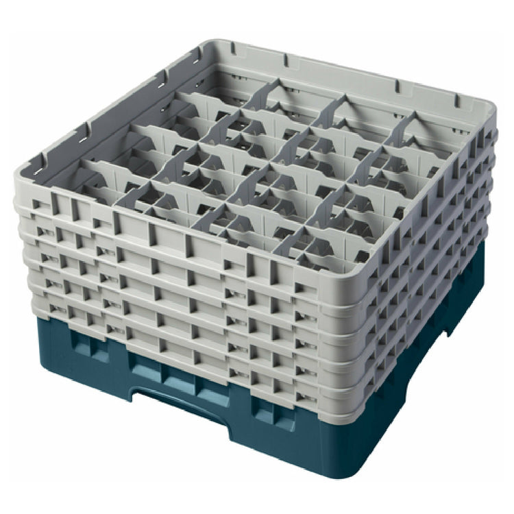 The Cambro 16S958414 Camrack® Glass Rack with (5) Soft Gray Extenders is a full-size glass rack designed to meet the demanding needs of the food service industry. Measuring 19-3/4" x 19-3/4" x 12-1/8", it provides ample space with 16 compartments, each capable of accommodating glassware with a maximum diameter of 4-3/8" and a height of up to 10-1/8". This ensures versatile storage options, making it suitable for a variety of glass sizes used in restaurants, catering services, and bars. The teal-colored rack, complemented by five soft gray extenders, is engineered for durability and ease of use. Its HACCP compliance and NSF certification highlight its commitment to safety and hygiene standards, making it an excellent choice for establishments that prioritize cleanliness. The rack's design not only offers superior protection and organization for glassware but also facilitates efficient washing and storage processes. This makes the Cambro 16S958414 Camrack® Glass Rack an indispensable tool for any food service operation aiming to maintain high-quality service while optimizing operational efficiency.
