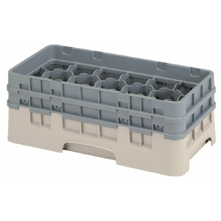 The Cambro 17HS434184 Camrack® Glass Rack With (2) Soft Gray Extenders Half Size is expertly designed for efficient storage and transport of glassware. Measuring 10 inches by 19-3/4 inches by 7-1/4 inches, this rack is compact yet capable, featuring 17 individual compartments. Each compartment accommodates glasses with a maximum diameter of 2-7/8 inches and a maximum height of 5-1/4 inches, making it versatile for various glass types within these dimensions. The included soft gray extenders provide additional height and stability, ensuring the safe handling of taller glassware. Crafted in a neutral beige color, the Camrack® is both visually appealing and practical, blending seamlessly into any professional kitchen or catering environment. Its adherence to HACCP standards demonstrates a commitment to food safety, while NSF certification assures compliance with rigorous public health criteria. This half-size glass rack is a valuable solution for restaurants, hotels, and catering services looking for reliable and efficient glassware management, offering a balance of protection and convenience in commercial settings.