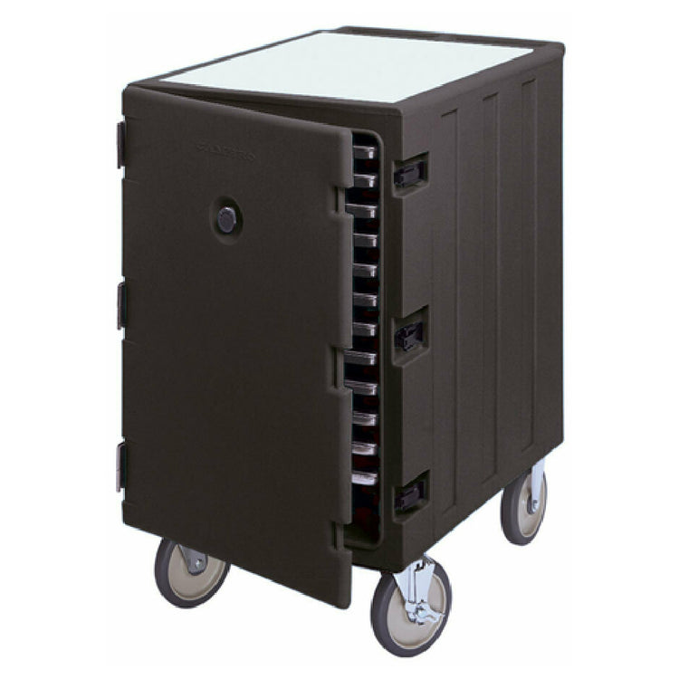 The Cambro 1826LTC615 Camcart® for Trays & Sheet Pans with Removable Cutting Board on Top is an expertly designed storage solution for professional kitchens, catering services, and bakeries. It is engineered to accommodate up to thirteen 18-inch by 26-inch trays or sheet/bun pans, making it a practical choice for operations with high volume and diverse storage needs. The Camcart features thirteen tray supports positioned at 1-3/4-inch centers, ensuring secure and organized storage of trays and pans. Measuring 32 inches in length, 21-1/2 inches in depth, and 37-1/2 inches in height, this unit offers a compact yet spacious design, ideal for maximizing storage capacity without occupying excessive floor space. It is equipped with four 6-inch casters, including two fixed, two swivel, and one with a brake, providing easy mobility and stability when needed. The charcoal gray exterior adds a professional aesthetic, while the inclusion of a removable cutting board on top enhances its functionality, providing a convenient surface for prep work. This Camcart is NSF certified, affirming its compliance with safety and sanitation standards, making it a reliable choice for any foodservice establishment seeking efficiency and convenience in tray and sheet pan storage.