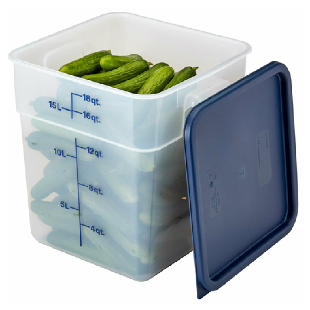 The Cambro 18SFSPP190 CamSquare® Food Container 18 Qt. is a versatile and practical solution for food storage, measuring 11-1/4"L x 12-1/4"W x 12-5/8"H. This container is engineered from polypropylene, a material renowned for its durability and resistance to stains and odors, making it a reliable choice for maintaining food quality. Its translucent design allows for easy content visibility without having to open the lid, while the blue graduation markings facilitate precise measurement of contents, enhancing inventory management. The container's built-in handles provide ease of handling and transportation, crucial for bustling food service environments such as restaurants, catering services, or institutional kitchens. Certified by the NSF, it ensures compliance with public health and safety standards. Additionally, it is dishwasher safe, which simplifies the cleaning process, saving time and effort in busy commercial settings. The Cambro CamSquare® Food Container's robust 18 qt. capacity makes it suitable for various food storage needs, from bulk ingredients to prepared dishes, offering a practical and efficient storage solution for diverse segments within the food industry. Its thoughtful features underscore its value as a vital component in any professional kitchen setup, ensuring practicality and hygiene with every use.