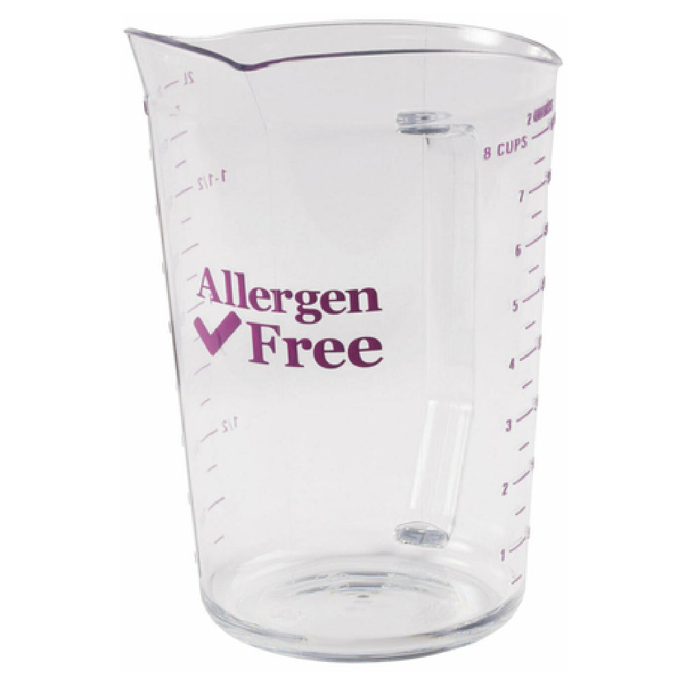 The Cambro 200MCCW441 Camwear® Measuring Cup 2 Qt. is a versatile kitchen essential designed for precise measuring in various culinary environments, including allergen-sensitive settings. This measuring cup features allergen-free purple graduations, providing clear visibility and ensuring that specific allergen protocols are adhered to in professional kitchens. It integrates an allergen-free logo imprinted directly onto its surface to further enhance its usability in specialized food service areas. Constructed from durable polycarbonate, this clear measuring cup is built to withstand the demands of regular use while maintaining its clarity and integrity over time. The molded handle offers a comfortable grip, facilitating seamless pouring and handling during food preparation. Furthermore, the Cambro 200MCCW441 is dishwasher-safe, allowing for convenient cleaning and maintenance. This measuring cup is NSF certified, indicating its compliance with rigorous public health and safety standards, which is particularly crucial for maintaining hygiene in food service operations. With a generous capacity of 2 quarts, it is suitable for a variety of measuring tasks, making it a valuable tool for chefs, bakers, and food service professionals who prioritize precision and safety in their operations.