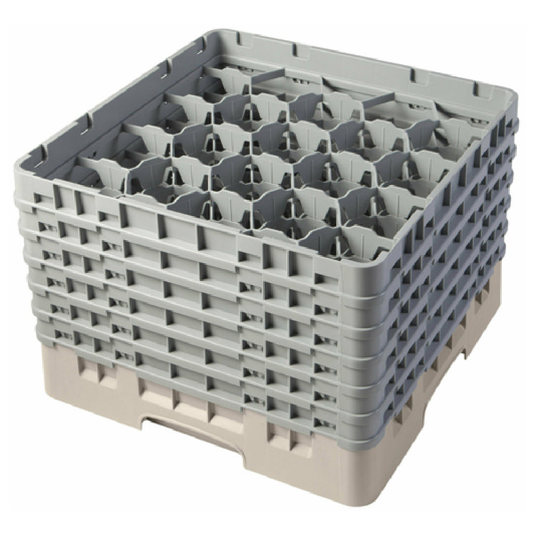 The Cambro 20S1114184 Camrack® Glass Rack with (6) soft gray extenders is a full-size, high-capacity storage solution tailored for various segments of the food service and hospitality industries. With dimensions of 19-3/4" x 19-3/4" x 13-3/4", it efficiently accommodates a wide range of glassware. This rack features 20 individual compartments, each designed to hold glassware with a maximum diameter of 3-7/8" and a maximum height of 11-3/4". The inclusion of six soft gray extenders enhances its capacity and flexibility for different glass sizes, making it suitable for restaurants, bars, and catering services that require organized and secure glassware storage. Its beige color not only provides a neutral aesthetic but also aligns with HACCP compliance to ensure sanitary conditions. The Cambro Camrack® is NSF certified, verifying its adherence to strict public health and safety standards. An ideal choice for establishments that prioritize cleanliness and efficiency, this glass rack facilitates streamlined operations by preventing breakage and ensuring easy access to glassware during service. Its robust construction and thoughtful design underscore its value as a reliable and essential component in any high-functioning professional kitchen or bar setting.