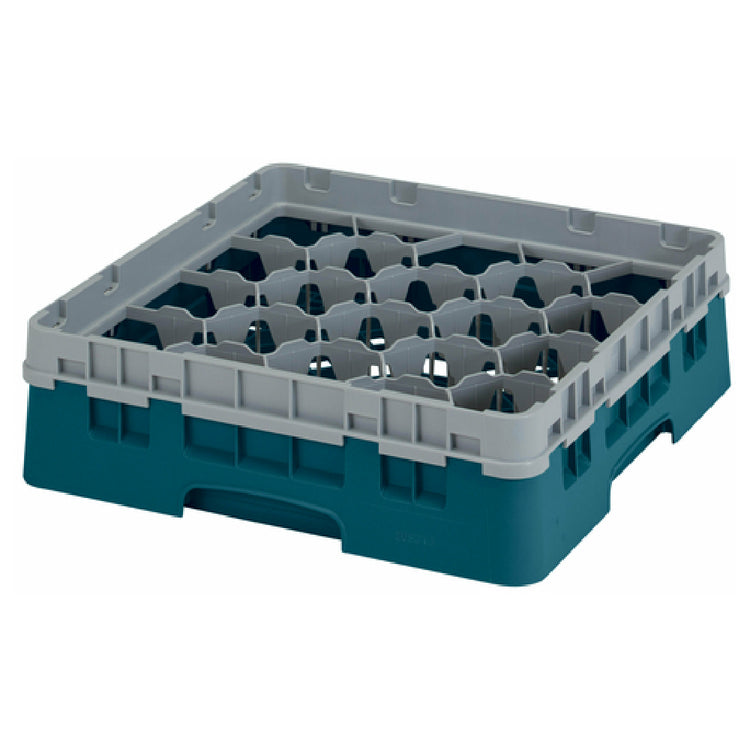 The Cambro 20S318414 Camrack® Glass Rack With Soft Gray Extender Full Size is a highly functional storage solution specifically designed for glassware in professional settings. Measuring 19-3/4" x 19-3/4" x 5-5/8", this rack encompasses 20 separate compartments, each accommodating a maximum diameter of 3-7/8" and a maximum height of 3-5/8", making it suitable for a variety of glass sizes. The full-size glass rack, complemented by a soft gray extender, offers enhanced flexibility and protection, ensuring glassware remains securely in place during transport and storage. The teal-colored rack is both HACCP compliant and NSF certified, assuring users of its high standards in health and safety compliance. This makes it an essential asset for those in the food and beverage industry, including caterers, restaurants, and bars, seeking an efficient and reliable glassware organization solution. The Cambro 20S318414 not only optimizes storage space but also facilitates ease of handling, which is crucial for fast-paced environments. Its construction and design reflect a commitment to quality, aligning with industry standards to meet the demands of hospitality professionals globally.