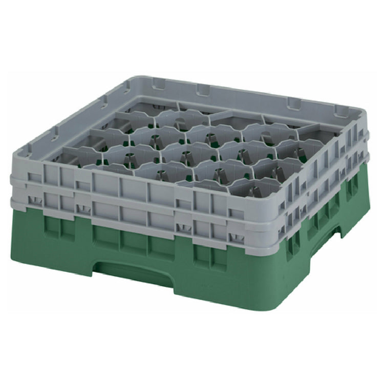 The Cambro 20S434119 Camrack® Glass Rack With (2) Soft Gray Extenders Full Size is a versatile and practical solution for glassware management in the foodservice industry. This full-size rack measures 19-3/4" x 19-3/4" x 7-1/4" and is equipped with 20 compartments, each accommodating a glass up to a maximum diameter of 3-7/8" and a maximum height of 5-1/4". Its design is enhanced by two soft gray extenders, providing additional depth and protection for taller glassware. The rack is crafted in a Sherwood green color, ensuring easy identification and organization within a busy kitchen environment. Compliant with HACCP standards and NSF certified, this glass rack ensures optimal hygiene and safety, making it suitable for a range of professional settings, from restaurants to catering services. The Cambro 20S434119 is engineered to streamline the washing, storage, and transport of glassware, thereby maximizing efficiency and minimizing breakage. Its robust construction and thoughtful design serve the needs of diverse market segments, including hospitality and event management, where reliable and practical glassware handling solutions are essential. This Camrack® Glass Rack exemplifies Cambro's commitment to quality and innovation in foodservice equipment.