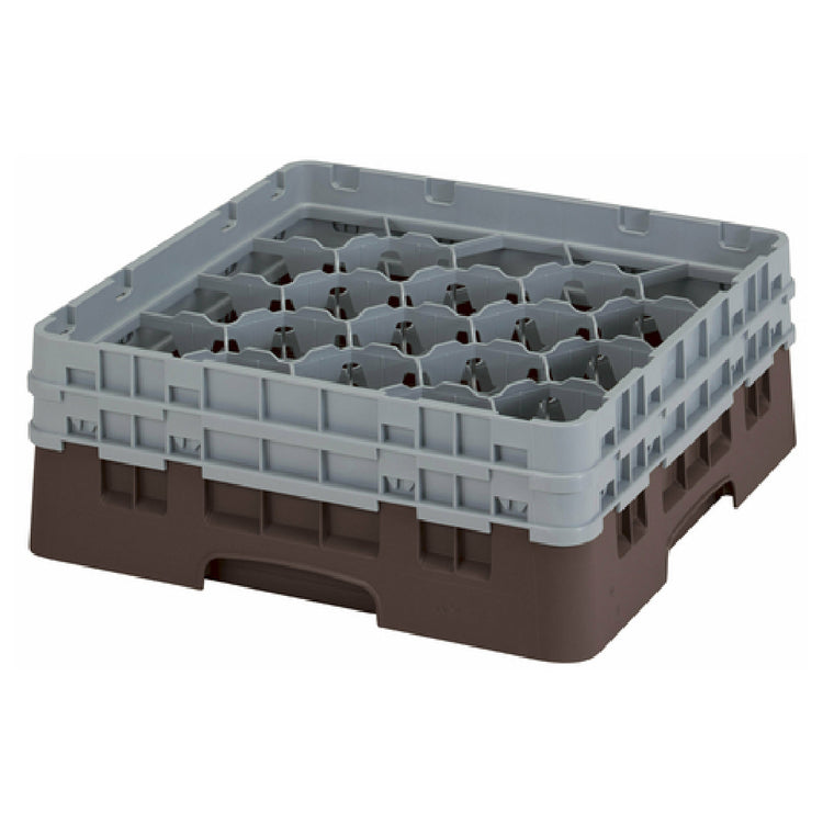 The Cambro 20S434167 Camrack® Glass Rack with (2) soft gray extenders is a full-size solution designed to enhance the efficiency and safety of glassware handling in various industries. Measuring 19-3/4 inches by 19-3/4 inches by 7-1/4 inches, this rack is engineered to accommodate a total of 20 compartments, each capable of holding glasses with a maximum diameter of 3-7/8 inches and a maximum height of 5-1/4 inches. The addition of two soft gray extenders ensures heightened flexibility and adaptability for larger or more uniquely shaped glassware, thereby broadening its applicability in sectors such as hospitality, catering, and food service. The rack's HACCP compliance aligns with rigorous food safety and sanitation standards, making it an ideal choice for establishments prioritizing hygiene and compliance. Its NSF certification further endorses its adherence to public health and safety regulations. With a distinctive brown color, the Cambro 20S434167 Camrack® Glass Rack is not only functional but also easy to identify within a busy work environment, underscoring its practicality and user-friendly design. Tailored for commercial use, this robust glass rack is an indispensable tool for ensuring the secure transport and storage of glassware across various professional settings.