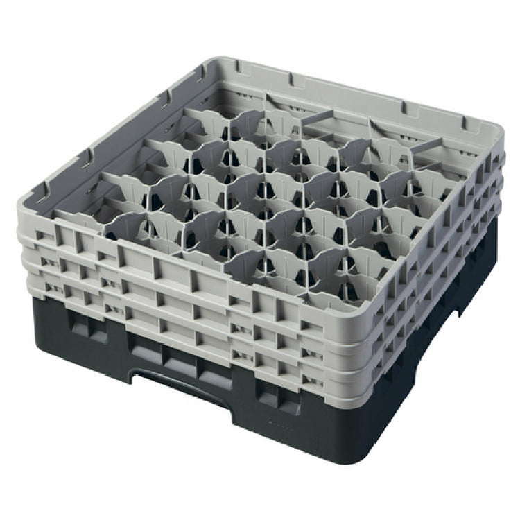 The Cambro 20S638110 Camrack® Glass Rack with (3) soft gray extenders is a full-size, heavy-duty solution designed for optimal glassware storage and transport. With dimensions of 19-3/4" x 19-3/4" x 8-7/8", it provides ample room for various glassware types, featuring 20 individual compartments, each accommodating a maximum diameter of 3-7/8" and a maximum height of 6-7/8". This glass rack is constructed in a sturdy black color, ensuring durability and ease of handling. The inclusion of three soft gray extenders allows for enhanced flexibility and capacity, making it suitable for operations requiring a scalable storage solution. This product is HACCP compliant, meeting rigorous safety and hygiene standards, which is crucial for food service environments. Additionally, it is NSF certified, further validating its reliability and quality in maintaining cleanliness and efficiency. The Cambro 20S638110 Camrack® Glass Rack is an essential asset for any establishment seeking to maintain the integrity of their glassware during washing, storage, and transportation, offering robust protection and organizational advantages suitable for restaurants, hotels, and catering services.
