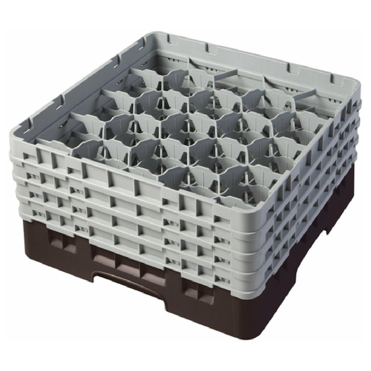 The Cambro 20S800167 Camrack® Glass Rack with (4) Soft Gray Extenders is an essential tool for efficient glassware management in the hospitality industry, featuring a full-size design measuring 19-3/4" x 19-3/4" x 10-1/2". This innovative rack includes 20 compartments, each accommodating glassware with a maximum diameter of 3-7/8" and a maximum height of 8-1/2", ensuring the secure transport and storage of various glass sizes. The addition of four soft gray extenders enhances the rack's versatility by allowing for the accommodation of taller glassware, providing flexibility for establishments that deal with an array of glass heights. Its robust brown construction is both HACCP compliant and NSF certified, indicating adherence to strict hygiene and safety standards crucial for food service environments. This glass rack's durability and compliance make it an invaluable asset for restaurants, catering services, and bars requiring reliable and organized glassware handling solutions, enhancing operational efficiency and ensuring glassware is maintained in pristine condition.