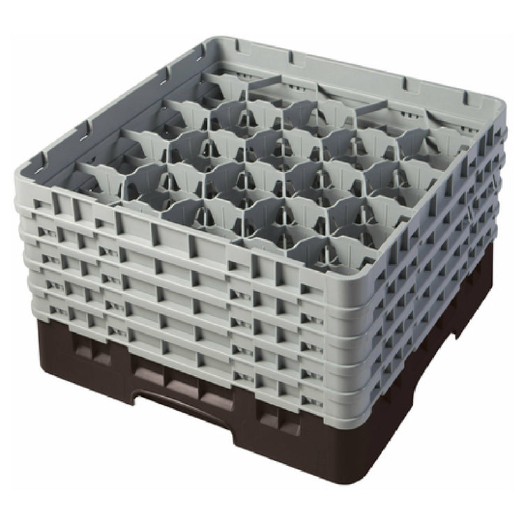 The Cambro 20S958167 Camrack® Glass Rack with (5) Soft Gray Extenders Full Size is an essential item for food service operations seeking reliable glassware storage and protection. With dimensions of 19-3/4" x 19-3/4" x 12-1/8", this full-size glass rack is expertly designed to accommodate a variety of glassware with its 20 compartments, each supporting a maximum diameter of 3-7/8" and a maximum height of 10-1/8". The inclusion of five soft gray extenders enhances its versatility, allowing it to securely hold taller glassware with ease. Constructed with a robust brown finish, the Camrack® ensures durability and an extended product life, while being HACCP compliant to meet rigorous industry safety standards. Additionally, this glass rack is NSF certified, attesting to its adherence to public health and safety guidelines. Its design is particularly beneficial in environments such as restaurants, hotels, and catering services where efficient handling and protection of glassware are paramount. The Cambro 20S958167 Camrack® Glass Rack offers a practical solution for any establishment seeking to optimize their glassware storage while maintaining high hygiene standards, making it a valuable asset in the professional kitchen setting.