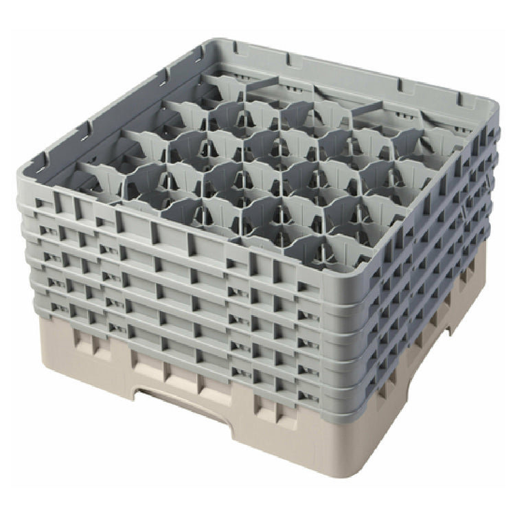 The Cambro 20S958184 Camrack® Glass Rack with (5) Soft Gray Extenders Full Size is expertly engineered to meet the demanding needs of various market segments within the food service and hospitality industries. This full-size rack measures 19-3/4" x 19-3/4" x 12-1/8", providing a substantial structure for efficient glassware management. It features 20 compartments, each designed to accommodate a maximum glass diameter of 3-7/8" and a height of up to 10-1/8", making it versatile for a range of glassware sizes. The inclusion of five soft gray extenders enhances its capacity and flexibility, ensuring it can adapt to different operational demands. Constructed in an appealing beige color, this glass rack is both HACCP compliant and NSF certified, aligning with stringent food safety and hygiene standards. The Cambro 20S958184 is thus a reliable tool for operations prioritizing safety and efficiency, offering optimal protection and organization for glassware. This makes it an indispensable asset for restaurants, hotels, and catering services that seek robust and standardized solutions for glassware management, emphasizing both durability and compliance with industry standards.