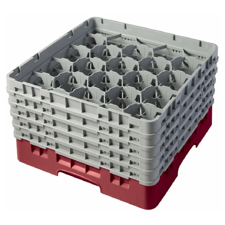 The Cambro 20S958416 Camrack® Glass Rack with (5) soft gray extenders is a full-size solution designed for efficient glassware storage and transport within the food service and hospitality industries. Measuring 19-3/4" x 19-3/4" x 12-1/8", this robust rack accommodates up to 20 compartments, each supporting a maximum glass diameter of 3-7/8" and a height of up to 10-1/8". The rack's distinctive cranberry color not only adds a touch of sophistication but also facilitates easy identification and organization in busy environments. Notably, the inclusion of five soft gray extenders provides additional height, enhancing capacity and protecting delicate glassware during handling and washing processes. The Cambro 20S958416 is HACCP compliant, aligning with industry standards to ensure food safety and hygiene, and carries the NSF certification, underscoring its suitability for rigorous commercial use. This glass rack is designed to meet the demands of various market segments, from bustling restaurants to large catering operations, offering a reliable and hygienic solution for glassware management. Its practical design and compliance with safety standards make it an indispensable tool for establishments seeking efficiency and quality in their operations.