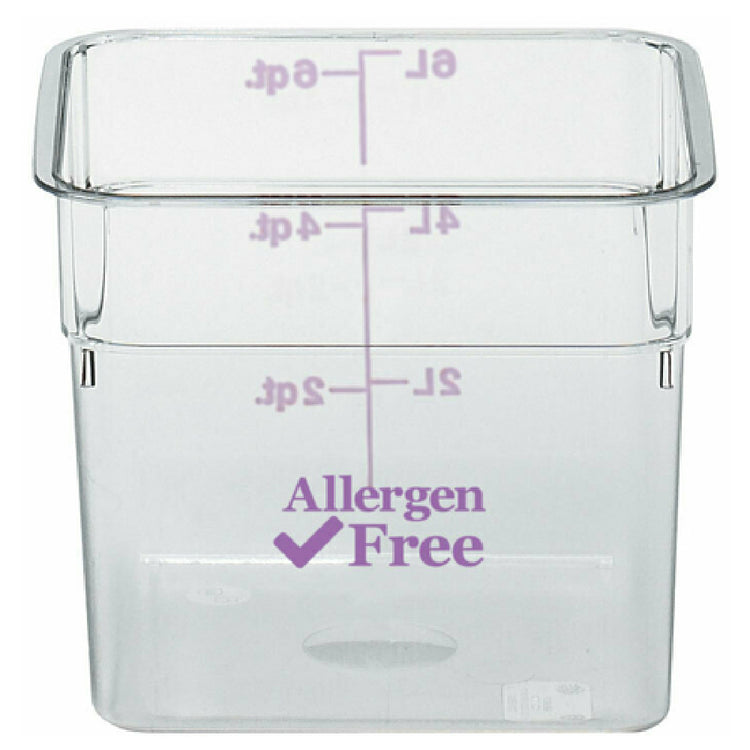 The Cambro 22SFSCW441 CamSquare® Food Container is a versatile and durable storage solution with a sizeable 22-quart capacity, measuring 11-1/4 inches in length, 12-1/4 inches in width, and 15-3/4 inches in height. Designed for both commercial kitchens and home use, this container features convenient handles for easy transport. It is crafted from polycarbonate material, which is renowned for its resilience, allowing the container to resist stains and odors, making it a long-lasting addition to any food storage collection. The clear construction allows for easy visibility of contents, while the imprinted allergen-free logo, highlighted in a distinctive purple, ensures food safety and reduces the risk of cross-contamination, catering to allergen-sensitive environments. The container is dishwasher safe, providing a hassle-free cleaning experience. NSF certification confirms that this product meets stringent public health and safety standards, making it a reliable choice for food service professionals. Whether you're storing bulk ingredients in a restaurant or organizing your pantry at home, the Cambro 22SFSCW441 CamSquare® Food Container delivers both practicality and peace of mind with its robust design and safety features.