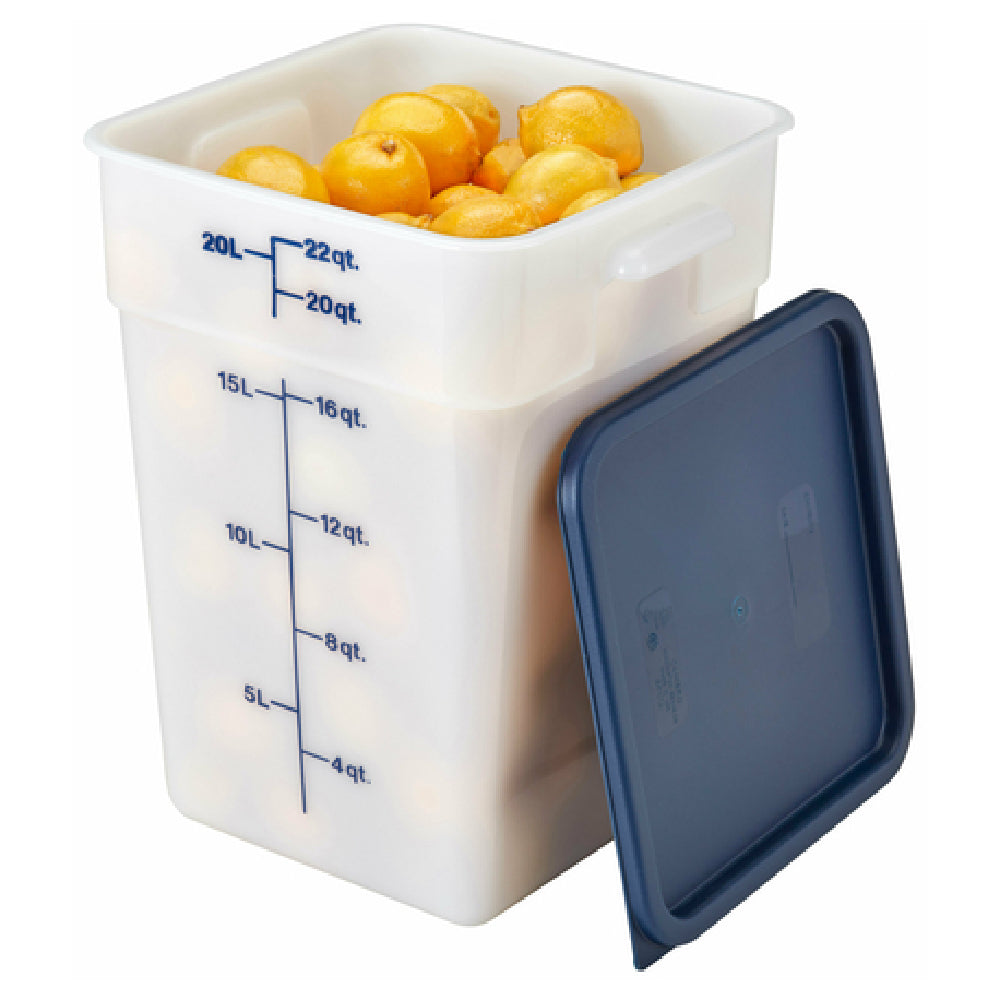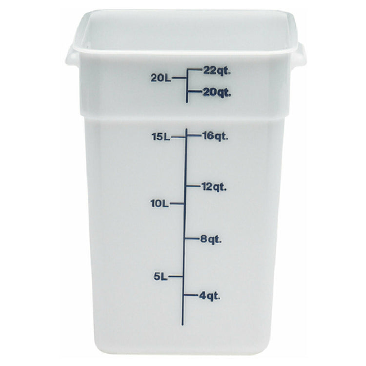 The Cambro 22SFSP148 CamSquare® Food Container is a versatile storage solution engineered to meet diverse food service needs. With a substantial capacity of 22 quarts, this container measures 11-1/4 inches in length, 12-1/4 inches in width, and 15-3/4 inches in height, making it suitable for a variety of kitchen environments. Crafted from durable polyethylene, it is both dishwasher safe and resistant to stains and odors, ensuring longevity and ease of maintenance. The container features blue graduations for accurate measurement, which is essential for portion control and inventory management. Its natural white color complements a range of kitchen aesthetics, while the inclusion of handles facilitates easy transport and handling. NSF certification further underscores its compliance with public health and safety standards, making it a reliable choice for professional kitchens. The Cambro 22SFSP148 is a practical and efficient container designed to enhance operational efficiency in food storage, preparation, and service across various sectors, from restaurants to institutional kitchens. Its combination of durable construction, user-friendly features, and compliance with safety standards positions it as a standout product in its category.