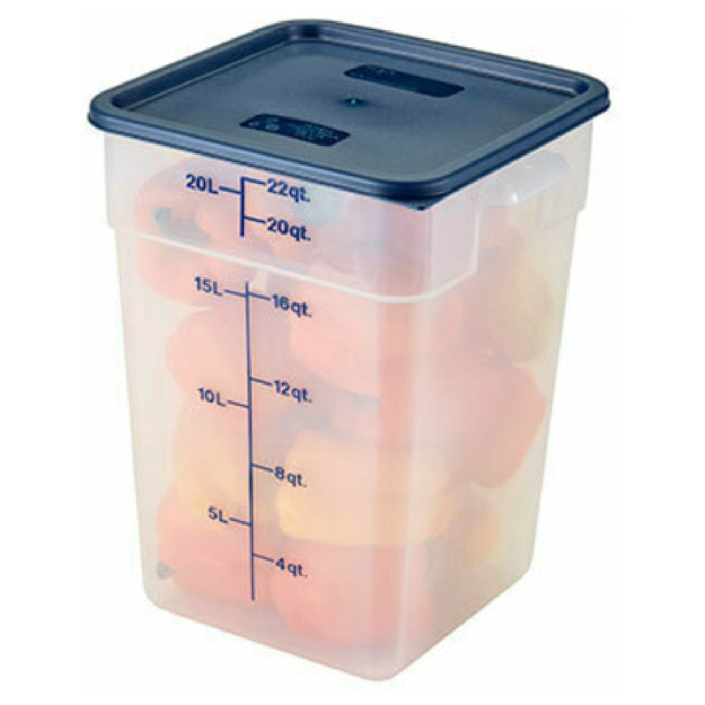 The Cambro 22SFSPP190 CamSquare® Food Container is a versatile and durable storage solution with a capacity of 22 quarts. Its dimensions are 11-1/4 inches in length, 12-1/4 inches in width, and 15-3/4 inches in height, making it an ideal choice for a range of food storage needs. Equipped with convenient handles, this container ensures ease of handling and transport. The inclusion of blue graduation marks allows for precise measurement, enhancing its utility in professional kitchens where accuracy is paramount. Constructed from polypropylene, the Cambro CamSquare® Food Container is designed to resist stains and odors, ensuring long-lasting cleanliness and hygiene. The translucent material allows for quick identification of contents without the need to open the lid, streamlining kitchen operations. Safe for use in dishwashers, this container supports efficient cleaning processes, making it a practical choice for busy food service environments. Certified by NSF, it meets rigorous public health and safety standards, reinforcing its reliability and quality. This container is ideal for various segments within the food industry, from commercial kitchens to catering services, offering a combination of robust construction, practical features, and compliance with health standards.