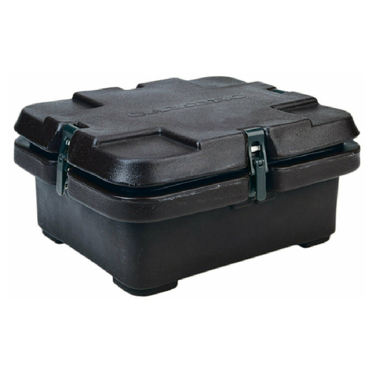 The Cambro 240MPC110 Camcarrier® is meticulously engineered to accommodate half-size food pans, seamlessly integrating with the Camdolly® CD1420 for enhanced mobility and storage solutions in food service environments. With an approximate capacity of 6.3 quarts, this Camcarrier efficiently holds one half-size pan up to 2-1/2" or 4" deep, catering to a variety of culinary applications. Its exterior dimensions measure 16-1/2"W x 13-7/8"D, offering a compact yet spacious design that fits seamlessly into any kitchen setting. Constructed from resilient polyethylene with foam insulation, the Cambro 240MPC110 ensures optimal temperature retention, safeguarding the quality of stored food. The inclusion of stacking lugs facilitates efficient storage, allowing multiple units to be securely stacked while conserving space. The product's black finish provides a sleek aesthetic, while its NSF certification guarantees adherence to stringent public health standards. Furthermore, its dishwasher-safe attribute underscores its practicality and ease of maintenance. This Camcarrier serves as a vital tool for catering services, restaurants, and other food service operations that demand reliable, high-quality food transportation and storage solutions.