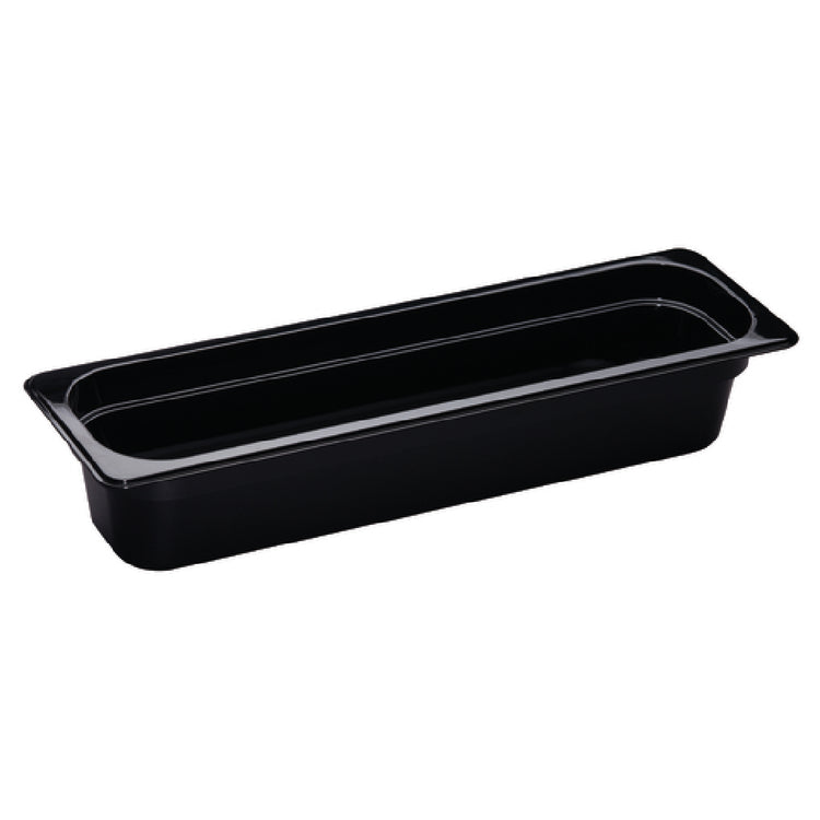 The Cambro 24LPHP110 H-Pan™ High Heat Hot Food Pan 1/2 Size Long 4" Deep is a versatile and durable solution for food service operations requiring reliable heat-holding capabilities. Crafted from high-temperature-resistant plastic, this pan efficiently withstands temperatures ranging from -40°F to 375°F, making it suitable for both hot and cold applications. Its non-stick surface ensures smooth food release and easy cleaning, enhancing the operational efficiency in busy kitchen environments. The pan’s robust construction resists bending and denting, offering long-lasting performance in high-demand settings. With a striking black finish, it adds a professional aesthetic to any culinary presentation. NSF certification guarantees compliance with stringent public health and safety standards, delivering peace of mind to operators across various segments of the food industry. Ideal for catering, buffets, and institutional settings, this 1/2 size long pan, at 4" deep, provides ample space for storing and serving a range of food items while maintaining optimal temperature and quality. The Cambro 24LPHP110 H-Pan™ sets a standard for quality and functionality, ensuring it is a reliable component of any kitchen setup.
