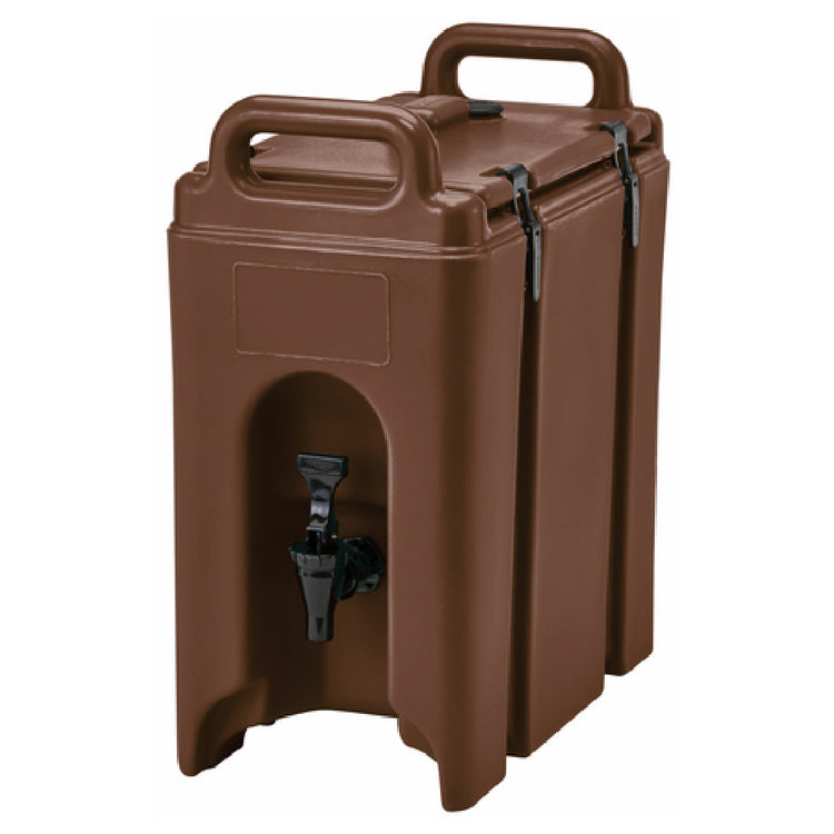 The Cambro 250LCD131 Camtainer® Beverage Carrier is a durable and efficient solution for beverage transportation, designed to meet the diverse needs of the foodservice industry. With a 2-1/2 gallon capacity, it is perfect for catering events, banquet services, or any situation requiring mobile beverage dispensing. Measuring 9"W x 16-1/2"D x 18-3/8"H, this carrier is compact yet spacious enough to fulfill various service demands. Made from insulated plastic, it ensures that beverages remain at their optimal temperature for extended periods, enhancing the service quality. The dark brown hue of the Camtainer® adds a professional appearance, suitable for both casual and formal settings. NSF certification reinforces its commitment to safety and sanitation, making it a reliable choice for any establishment. Whether in a bustling restaurant, on a busy catering line, or at a steady coffee station, the Cambro 250LCD131 is engineered to provide unparalleled performance and versatility, effectively catering to the unique demands of different market segments within the foodservice industry. Its robust construction and thoughtful design prioritize durability and functionality, making it an essential asset for efficient beverage service operations.