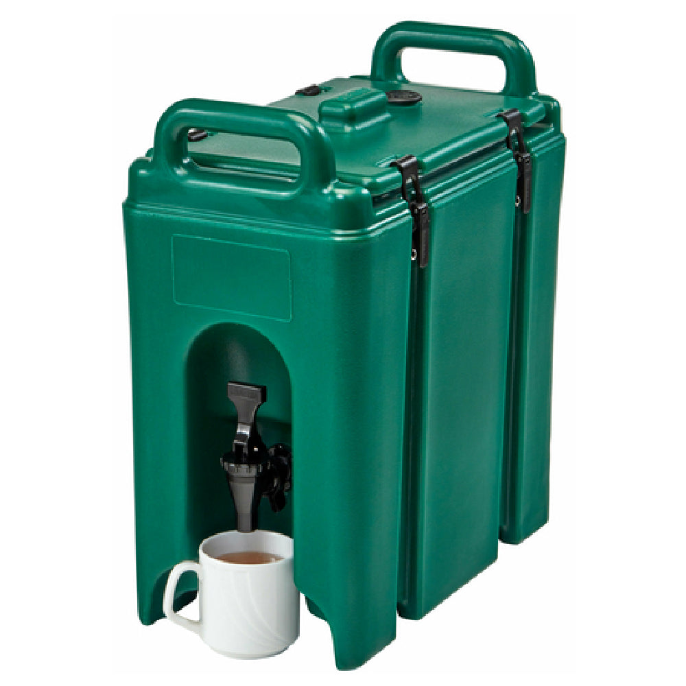 The Cambro 250LCD519 Camtainer® Beverage Carrier is a dependable solution for transporting beverages, featuring a capacity of 2-1/2 gallons. With dimensions of 9 inches in width, 16-1/2 inches in depth, and 18-3/8 inches in height, this insulated plastic carrier is designed to maintain optimal temperature conditions, whether hot or cold. Available in a distinctive Kentucky green color, it stands out in any professional setting. The Camtainer® is NSF certified, which ensures that it meets rigorous public health and safety standards, making it a reliable choice for catering events, restaurants, and cafeterias where hygiene and safety are priorities. Its robust construction and efficient design make it an ideal choice for a variety of markets within the food service industry, from large-scale event caterers to smaller food service establishments requiring portable beverage solutions. The Cambro 250LCD519 is engineered for durability and performance, offering a practical and efficient means of beverage transportation that aligns with professional standards and needs.