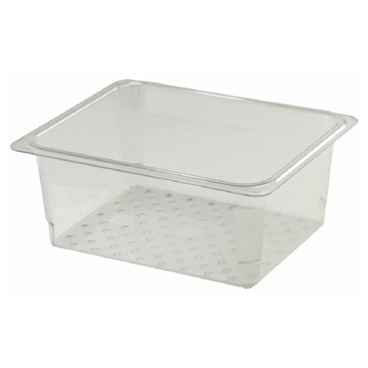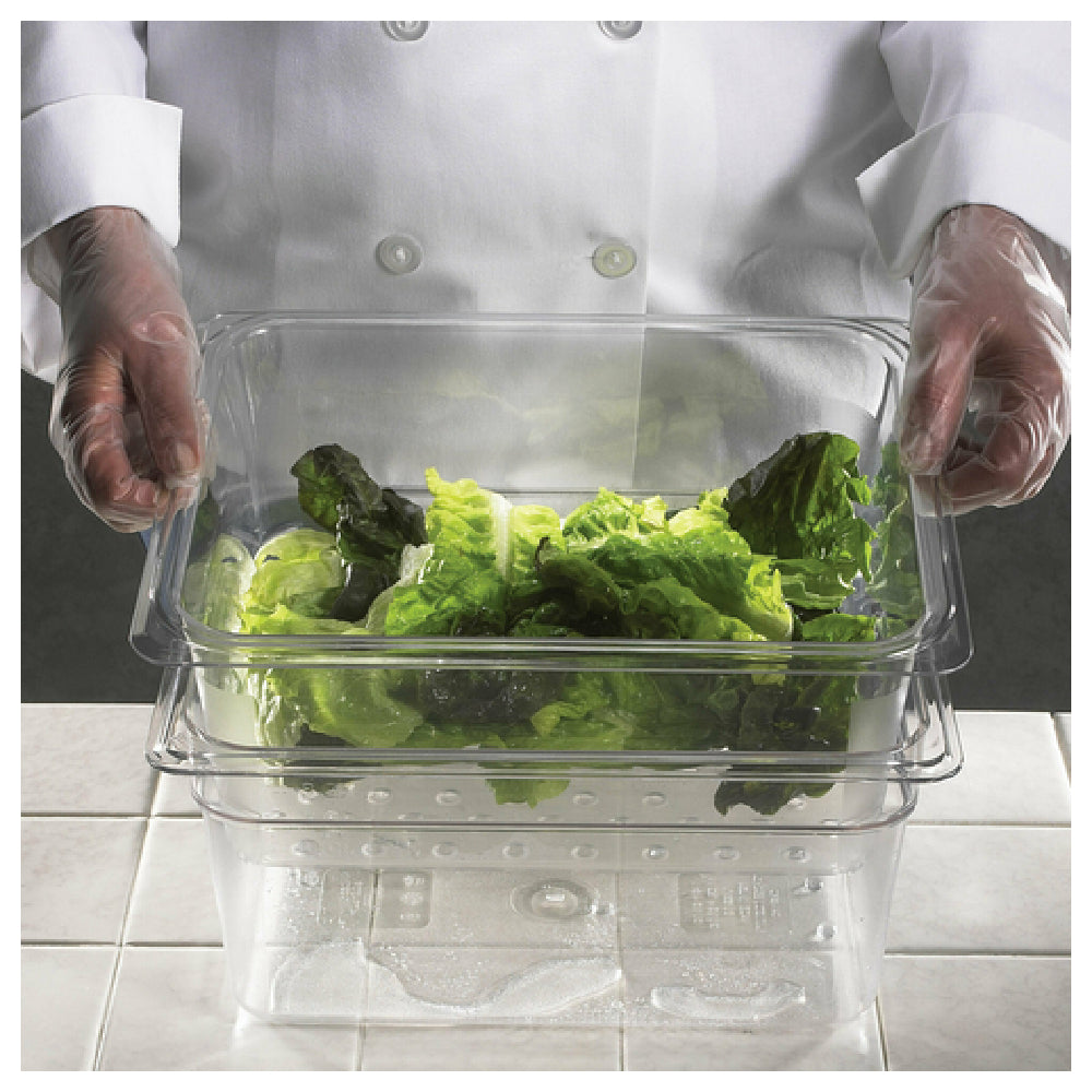 The Cambro 25CLRCW135 Camwear® Colander is a versatile kitchen essential designed to enhance functionality and efficiency in professional culinary settings. Measuring 10-7/16 inches by 12-3/4 inches with a 5-inch depth, this colander is meticulously crafted to fit 1/2 size food pans seamlessly. Made from clear polycarbonate, it offers exceptional durability and visibility, allowing for easy monitoring of contents. The NSF certification underscores its adherence to stringent health and safety standards, making it a reliable choice for food service operations where hygiene is paramount. The clear construction not only supports a clean and organized kitchen environment but also facilitates quick identification of ingredients. Its compatibility with 1/2 size food pans ensures a secure fit, reducing the risk of spills during preparation and transport. This colander's robust design is ideal for various market segments within the food industry, including restaurants, catering services, and institutional kitchens, providing a practical solution for efficient food preparation and draining. With the Cambro 25CLRCW135 Camwear® Colander, culinary professionals can benefit from a product that combines strength, convenience, and compliance, ultimately contributing to a streamlined and effective kitchen workflow.