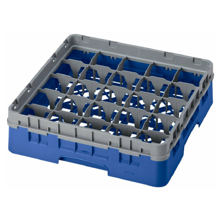 The Cambro 25S318168 Camrack® Glass Rack with Soft Gray Extender Full Size is a meticulously designed solution for safely storing and transporting glassware across various segments of the foodservice industry. This full-sized rack measures 19-3/4 inches by 19-3/4 inches by 5-5/8 inches and is crafted to accommodate 25 compartments, each supporting a maximum glass diameter of 3-7/16 inches and a maximum height of 3-5/8 inches. The soft gray extender enhances the rack's adaptability, allowing it to securely hold a variety of glass sizes, ensuring versatility in busy kitchen environments. The rack is NSF certified, assuring compliance with public health and safety standards, while its HACCP compliance underscores its efficacy in systematic preventive measures in food safety. The vibrant blue construct not only aids in easy visual identification but also adds an aesthetic appeal. Suitable for use in high-volume operations, this glass rack supports streamlined operations and reduces breakage risks, making it a valuable asset for caterers, banquet halls, and restaurants aiming for efficiency and reliability. Its robust design meets the rigorous demands of the hospitality sector, providing a dependable and hygienic solution for glassware management.