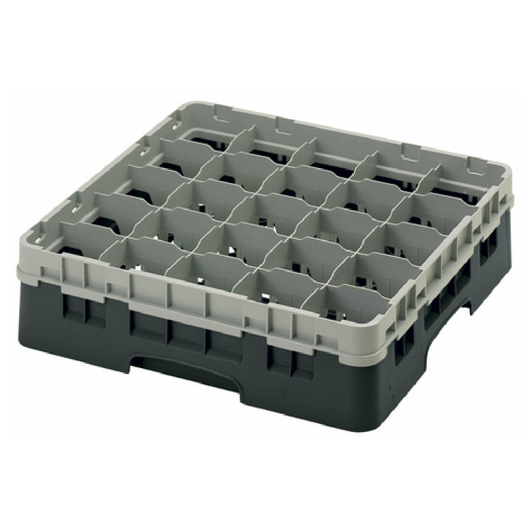 The Cambro 25S418110 Camrack® Glass Rack With Soft Gray Extender Full Size is a meticulously designed utility for the food service industry, distinguished by its comprehensive functionality and precise engineering. This full-size rack measures 19-3/4" x 19-3/4" x 5-5/8", providing a low-profile storage solution suitable for commercial kitchens and catering operations. Featuring 25 individual compartments, it accommodates glasses with a maximum diameter of 3-7/16" and a maximum height of 4-1/2", ensuring safe and efficient washing and transportation. The inclusion of a soft gray extender enhances its utility, offering additional support and stability. Crafted in a sleek black color, this glass rack aligns with HACCP compliance and bears NSF certification, ensuring adherence to high standards of hygiene and public health safety. These features make the Cambro 25S418110 Camrack® Glass Rack an invaluable asset for diverse markets within the food service sector, such as restaurants, hotels, and event venues, where efficient glass handling and maintenance are paramount. Its robust and practical design supports the seamless organization and protection of glassware, contributing to streamlined kitchen operations and superior service delivery.
