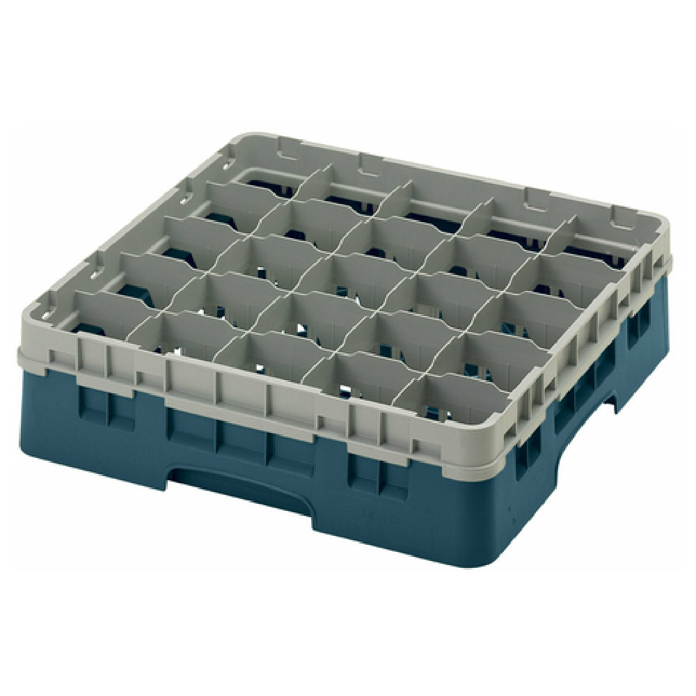 The Cambro 25S418414 Camrack® Glass Rack with Soft Gray Extender Full Size is an expertly designed glass rack, ideal for efficiently organizing and protecting glassware in various commercial settings. With dimensions of 19-3/4" x 19-3/4" x 5-5/8", this low-profile rack offers a practical solution for maximizing storage space while ensuring the safety of delicate items. It features 25 compartments, each capable of accommodating glassware with a maximum diameter of 3-7/16" and a maximum height of 4-1/2", making it suitable for a wide range of glass sizes. The rack's teal color adds a touch of vibrancy to any kitchen or bar environment. Crafted with HACCP compliance in mind, it supports food safety and sanitation standards, crucial for the hospitality and food service industries. Additionally, the NSF certification guarantees that it meets stringent public health regulations. The inclusion of a soft gray extender enhances its adaptability, allowing for secure stacking and storage solutions. This makes the Cambro 25S418414 Camrack® Glass Rack an invaluable asset for restaurants, bars, and catering businesses seeking reliable and efficient glassware storage. Its durability and thoughtful design cater to the diverse demands of professionals in the food and beverage industry.