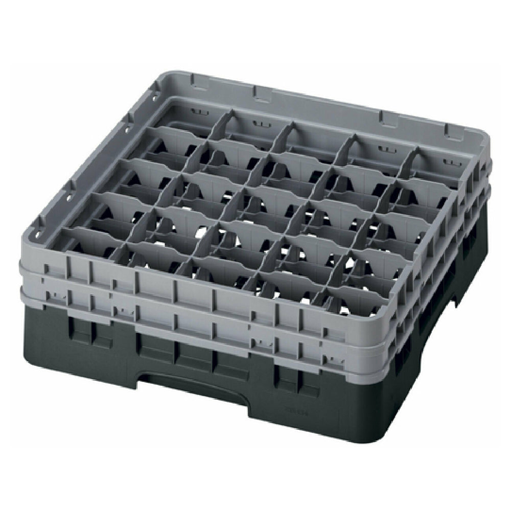 The Cambro 25S434110 Camrack® Glass Rack with (2) Soft Gray Extenders Full Size is a meticulously designed solution for efficient and safe glassware storage and transportation in a variety of professional environments, including restaurants, catering services, and hospitality venues. This full-size rack, measuring 19-3/4" x 19-3/4" x 7-1/4", features 25 compartments, each accommodating glassware with a maximum diameter of 3-7/16" and a height of up to 5-1/4". The two soft gray extenders enhance its capacity and versatility, ensuring a snug fit for different glass sizes while preventing damage. Crafted in a sleek black finish, the rack's construction adheres to HACCP guidelines, ensuring it meets essential hygiene and safety standards. Additionally, the NSF certification attests to its compliance with rigorous health and sanitation requirements. The Cambro Camrack® is an essential asset for any commercial kitchen or bar, providing durability, ease of use, and reliability in glassware management. Its thoughtful design not only protects glassware but also streamlines operations, making it an indispensable tool for ensuring high service standards in fast-paced environments.